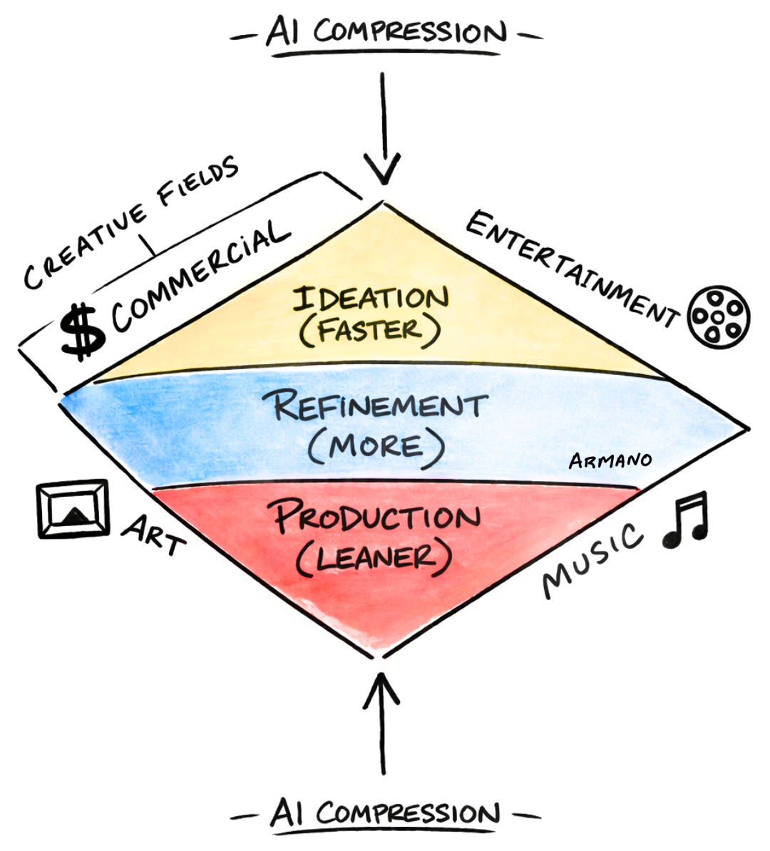 Long story short—I succeeded, way beyond what I had envisioned in those formative years. Now, I imagine if one of my sons came to me at the same age in the middle of the night and expressed a desire to get into one of the creative fields (I had chosen “commercial” via the diagram above—a broad category where many creative professionals work either full time ot freelance across numerous fields from writing to design to marketing, consulting etc.)… I think I’d be as supportive as my mother ultimately was, BUT I’d have a long discussion about the state of the industry they were choosing, and it’s a state more compressed than it ever has been before, and we can thank, or curse AI, for this. In the not-so-distant future, there will be both thanking and cursing alike.